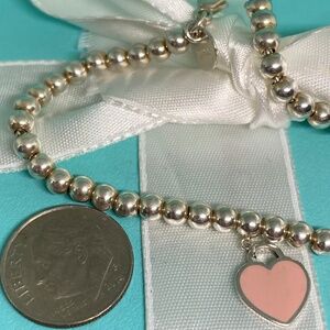 Tiffany Co. Silver 925 Blue Enamel Mini Heart Tag Charm 4mm Bead Ball Bracelet. This bracelet has been cleaned and polishes in excellent preloved condition. Pink enamel is in good condition and has retained its original color. This is pink, not hot pink. The bracelet measures six and three-quarter inches. This returned to Tiffany mini heart tag bracelet will come in a Tiffany box and a generic pouch. This is a classic design that can be worn every day.