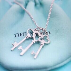 Elegant silver key necklace by Tiffany & Co. Features three key charms on a delicate chain.