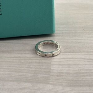 This exquisite Tiffany & Co. ring features a sleek, modern design crafted in lustrous silver. Adorned with small, round diamonds set flush around its circumference, the ring exudes elegance and sophistication. Its smooth, polished surface and medium-width band make it a timeless accessory for any occasion.