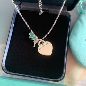 Elegant Tiffany & Co. necklace featuring a silver heart and key design with a touch of blue. Perfect for adding a sophisticated charm to any outfit.