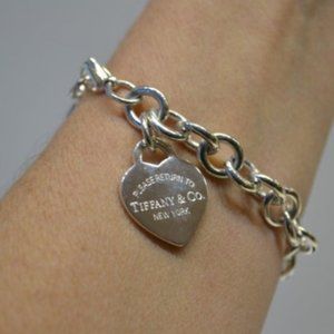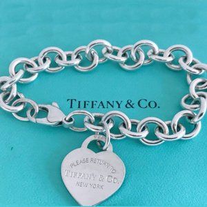 Tiffany & Co. Sterling Silver Heart Tag Charm Bracelet. Marked .925 For Sterling Silver"Please Return To Tiffany & Co". Bracelet is approximately 7.25" long. Lobster Claw closure. Heart Approximately 1 1/8" At Widest. Great Addition To Your Tiffany Collection Or As A Gift! Always A Classic! Total Silver Weight = 33.0 Grams. Will come in Tiffany Box or Pouch.