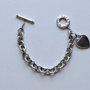 Beautiful Authentic Tiffany & Co. Sterling Silver 925 Blank Heart Tag Toggle Charm Rolo Link Bracelet approximately 7 1/2" in length with clasp. Comes with original Tiffany box! Bracelet weighs about 42.4 grams, is marked "TIFFANY & Co. 925" and is in pre-owned used condition. Please see photos for detail. (P)