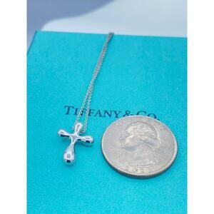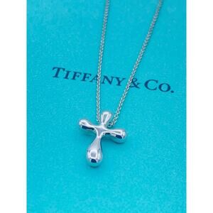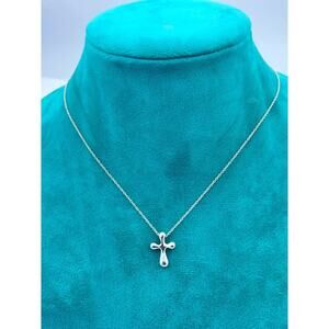 Authentic Tiffany & Co. Sterling Silver Cross Pendant Necklace with an 16 Inch chain. Features a delicate cross charm measuring approx. 0.8" x 0.5", crafted in high-quality .925 sterling silver. Stamped Tiffany & Co. 925.