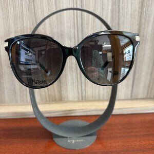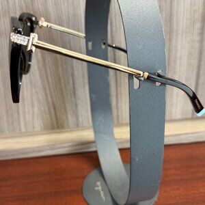 The pillow shape frame, crafted from durable yet lightweight black colored acetate, is adorned with exquisite details and polished finish.