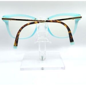 Tiffany & Co Tortoise, Gold & Blue Eyeglasses Frame TF2186 8275 Women's 50-18-140. These pre-owned eyeglasses are in excellent condition with only slight smudges. The full-rim acetate frame features a stylish tortoise pattern with a blue interior, complemented by gold metal arms and tortoise/blue acetate arm tips.