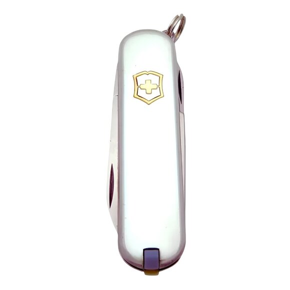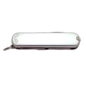 This is a wonderful Tiffany & Company Victorinox Swiss Army pocket knife that is crafted of 925 sterling silver with an 18K 750 yellow gold emblem. It features a Swiss stainless steel knife blade, scissors, tweezers, a nail file, and a durable Melmac plastic pick. It measures 2 1/4 inches long when closed, and 3 7/8" in length with the blade extended. The Victorinox brand is known for its high-quality and durable knives, making this collectible folding knife a desirable item for knife enthusiasts and collectors alike. It is in excellent pre-owned condition and includes its original pouch.