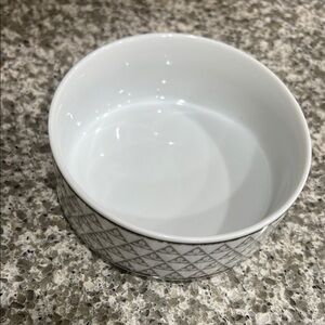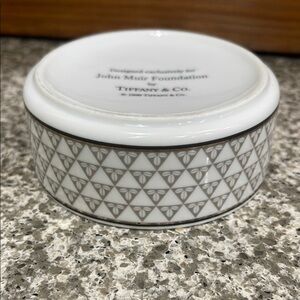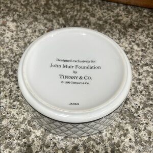 Elegant bowl Tiffany and co dish with a gorgeous geometric pattern. Features white and silver gray colors. Perfect for home decor, trinket dish, cat dish, small serving dish. Made for the John Muir Foundation. In perfect condition
