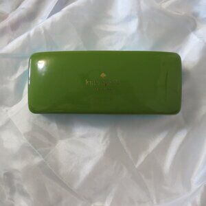 Kate Spade hard shell eyeglass case, two-tone color, Olive green and turquoise blue, dimensions: 1 ½ H X 2 ½ H X 6”L, scratch in back of the case, but not a major scratch, otherwise is in very good pre-owned condition.