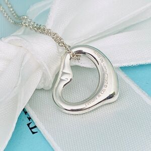 Retired beautiful Tiffany and Company open heart necklace designed by Elsa Peretti. The 925 heart necklace measures 16 inches in length. There is a magnificent sparkly pink sapphire bezel set in the heart. Elsa Peretti started signing for Tiffany in 1974 and her open heart is a classic design. This Peretti sapphire open heart necklace is an excellent pre-loved condition and ready for giftgiving. The necklace will come in a Tiffany box and pouch.