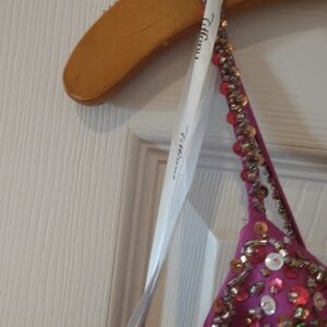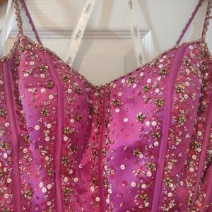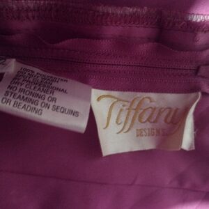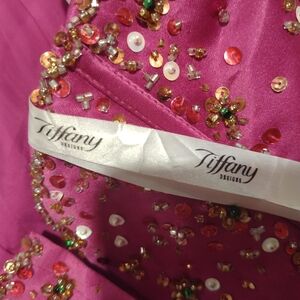 The dress features a designer theme, making it a unique and fashionable choice. It comes with a matching bag, making it a complete look. This dress is perfect for formal events such as prom or homecoming. Make a statement and feel confident in this beautiful Tiffany Designs dress.