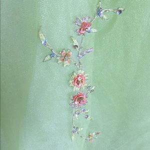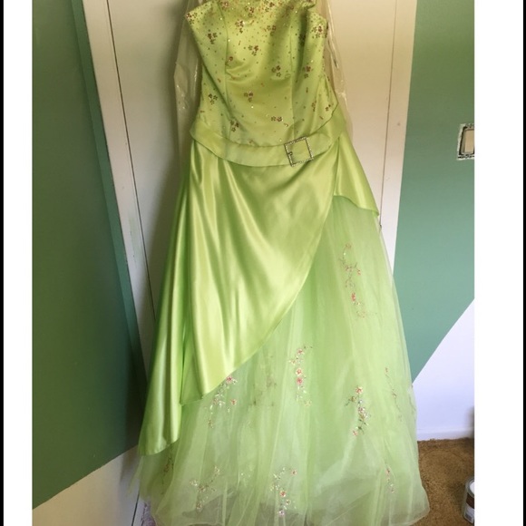 Only worn once to prom and dry cleaned after. No rips or stains. Was slightly altered to remove some of the poofiness. The spaghetti straps were also tacked in but can easily be removed to be strapless. Gorgeous beading on bodice and skirt. Zip up back.
