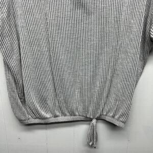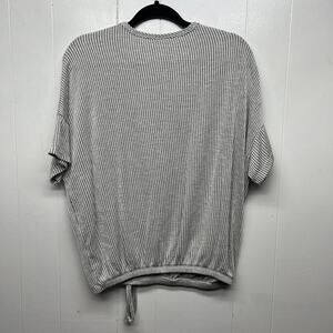 Tiffany & Grey women's ribbed gray top. Round neck. Short sleeves. Tie front hem. Stretch. In good used condition. No stains, tears or holes.