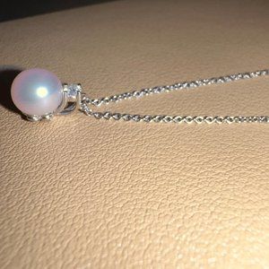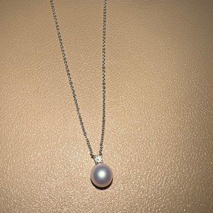 "Pendant in 18k white gold with an Akoya cultured pearl and a round brilliant diamond. On a 16" chain. Pearl, 6.5-7 mm. Round brilliant diamond, carat weight .05.