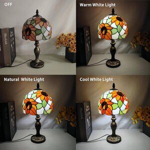 Sunflower Tiffany Table Lamp: small stained glass lamp height is 15 in and the lampshade wide is 8 in. The base is sturdy and heavy. It is made of resin. So you don't have to worry about it being easily knocked over. 1PC 5W 3 Color Temperatures LED Bulb Included. The cord has the on/off switch. Change Light Color Temperature Via ON/OFF Switch.