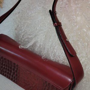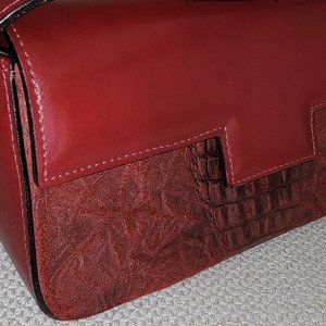 Beautiful deep red bag. 100% leather combines both smooth and "crocodile embossed" finish. 1 zippered interior pocket. Magnetic closure, silver footpads.