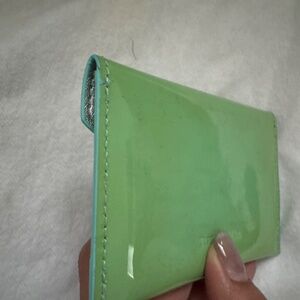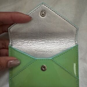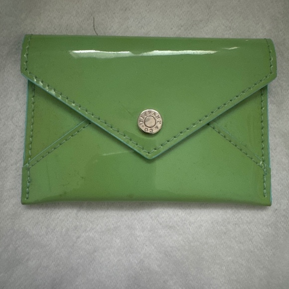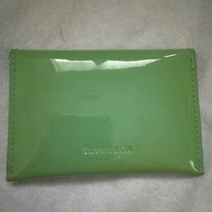 Tiffany envelope card holder. Can fit business cards or credit cards. Patent leather. The case is faded but still has life.