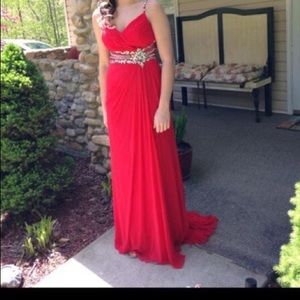 Tiffany style prom dress. Sequence butterfly back and a sequence see through midsection. Worn only one time. Beautiful elegant prom dress with a small train that flows from behind.