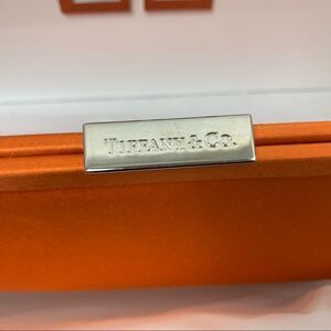 Orange satin Tiffany & Co. Holly clutch with silver-tone hardware, signature Tiffany blue satin lining, zip pocket at interior wall and push-lock closure at top frame. Includes dust bag and Tiffany box with a Tiffany shopping bag.