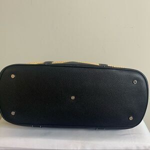 Tan rattan bag with dark brown leather trim.  The brown is so dark it looks black.