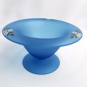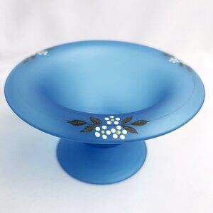 Tiffin Blue Satin Glass Rolled Edge Compote Vintage Hand-Painted Floral Design