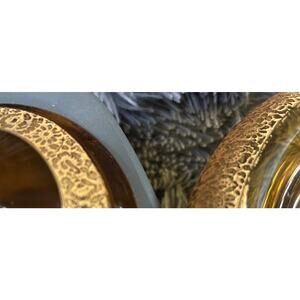 Make your dining experience stunning with this elegant amber glass bowl and matching candlesticks with etched gold encrusted and rolled rim floral pattern. Lovely decorative pieces that are truly functional.