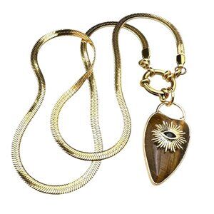 This stunning tiger eye gemstone heart pendant features an evil eye design, symbolizing protection. It's elegantly set on an 18K gold plated chain, perfect for adding a touch of elegance to any outfit.