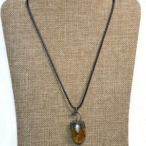 Tiger Eye & Rutilated Quartz Necklace with crown Mounting. Highly polished and very attractive. Comes with a black cord. Adjustable to about 18” max.