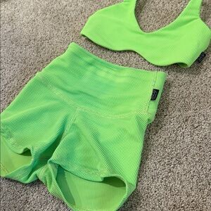 Vibrant neon green ribbed dance set from Tiger Friday. Includes a top and shorts. WARNING!! The shorts are free because there is a dye or something on the front of the shorts. I didn’t even see it for awhile because it does blend it haha but I’m sure anyone with laundry skills could get that out or at least looking better. Both child small