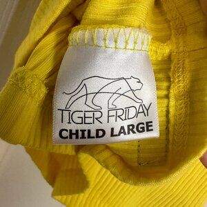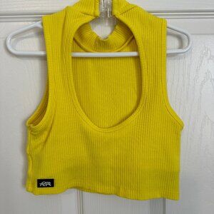 Ribbed yellow crop top. Clasp at neck, keyhole back.