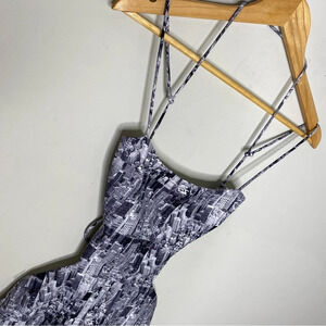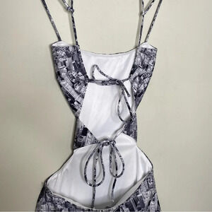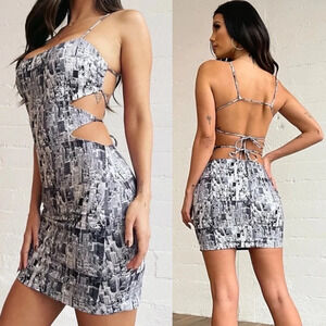 FEATURES: fun skyline/building print; bodycon; lace up open back; min length