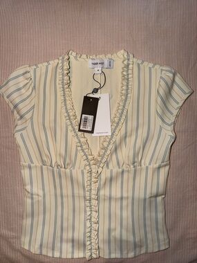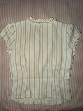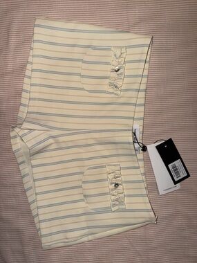 Cream blouse and mini shorts with thin blue and tan horizontal stripes. Adjustable buttons accents on top. Front patch pockets with ruffle and button accents. Clean, tailored silhouette for everyday wear. Lightweight, breathable fabric for warm weather.