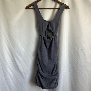 Tiger Mist Kai Mini Dress in Steel Blue. Halter neck. Plunge rounded neckline. Cut out detail on waist. Tie up detail on back. Ruched skirt. Super soft and stretchy. Size small.