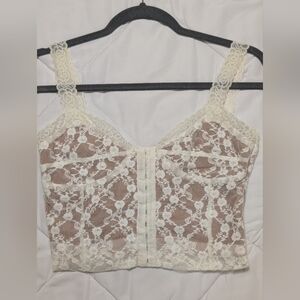 Elegant lace crop top by Tiger Mist. Features intricate cream and white lace design. Perfect for stylish outings.