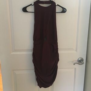 NWT. Never worn. Burgundy/plum tone, bodycon, ruched lower half, halter, key hole front. Dress up with heels or thigh high boots...dress down with booties and a leather jacket! Purchased from Nasty Gal!