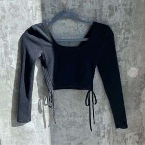 Tiger Mist Ribbed Ruched Drawstring Cropped LOng Sleeve Tee in black