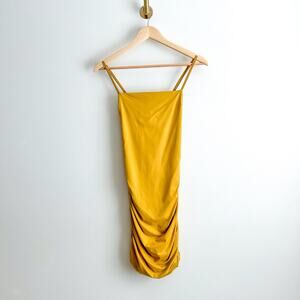Details: Tiger Mist. Sunrise Ruched Dress - Size: M - Color: Mustard - Material: 90% Nylon, 10% Spandex - Features: Tie-Back