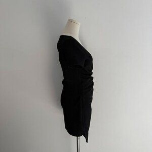 Flattering black mini dress from Tiger Mist, featuring a wrap-style deep V neckline, short sleeves, and body-hugging ruched detail through the waist. Made with a textured stretch fabric that gives it a luxe feel while still being super comfy. Zips up the back for a sleek finish. Perfect little black dress for a night out, date night, or party.