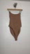 Chic tan bodysuit with crisscross straps. Perfect for stylish outings. Very stretchy. Size large. Hook and eye enclosure.