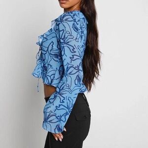 Features a ruffled deep V neckline, flared sleeves, tie-front closure, and a slightly cropped fit. Super lightweight and perfect for layering. Abstract blue floral print. Unlined
