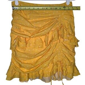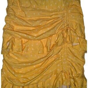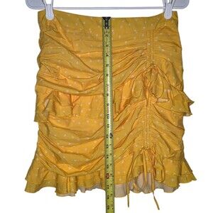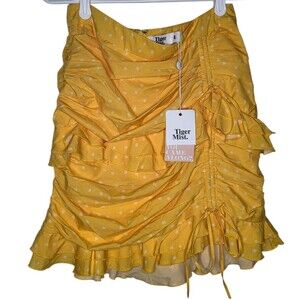 The product is a brand new Tiger Mist yellow skirt with tags, featuring a large size and a vibrant floral design. This stylish women's clothing item is perfect for adding a pop of color and a touch of femininity to any outfit. The skirt is designed to be a statement piece with its eye-catching yellow color and floral theme, making it a versatile and trendy addition to any wardrobe.
