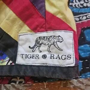 colorful and unique! unique painted textile used along with bright solids. very comfortable fabric, assuming cotton. no size listed, but fits like a medium