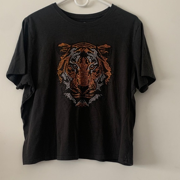 Grey t-shirt featuring a tiger design with orange and white and black rhinestones. It fits like a crop top or baby tee.