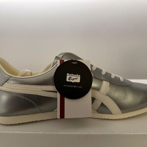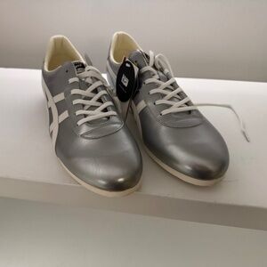 Brand new, with tags still on, Onitsuka Tiger Tai-Chi-NM in pure silver and white, men's size 12.5.