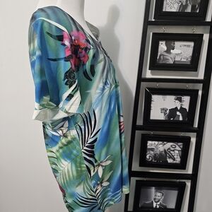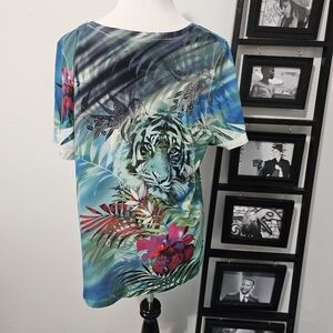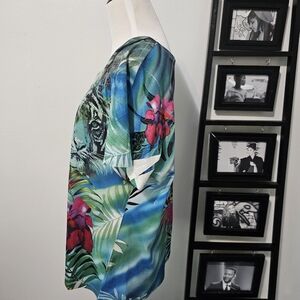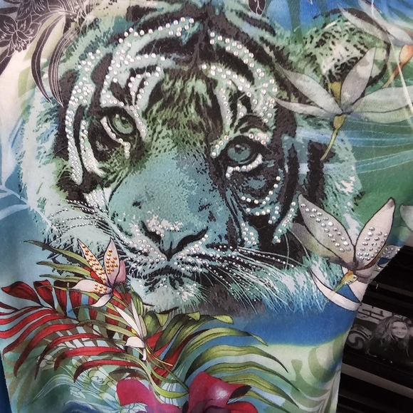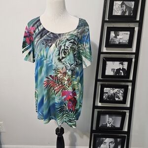 This colorful tiger top is one of a kind. It is a 0X, and it's flattering on. The colors are bright and super pretty.