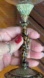 This is a vintage red wine glass goblet with a jeweled enamel tiger stem. Measures approximately 8.5 in Tall x 3.25 in across the top. Very good preowned condition.