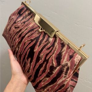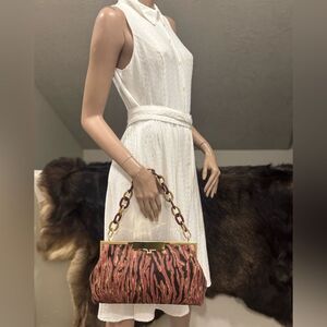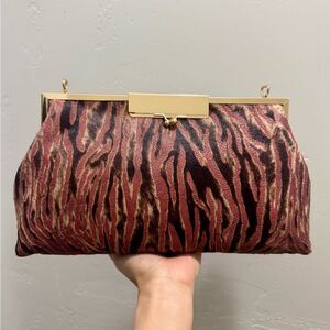 Handmade from very special genuine hair on cowhide, beautiful tiger stripes pattern, embossed texture with random short fur. Both sides are similar & beautiful. Vintage style metal frame with kiss-lock closure. Includes 3 style straps, use in multiple ways, can be clutch, underarm, crossbody, or a shoulder bag.