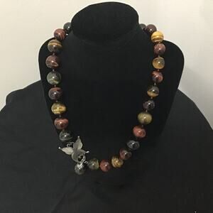 NWOT. This genuine gemstone beaded 788.50 ctw South African necklace has 14-17mm smooth beads that are hand-knotted together. It is a 20 inch necklace that is embellished with an enchanting butterfly motif. This decorative toggle clasp makes the necklace safe and secure around the neckline. The unique chatoyancy effect of these genuine Tiger's Eye beads creates a silky shimmering effect. Multicolored. Check my closet for the matching bracelet.