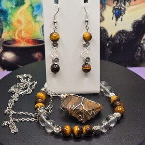 Tiger's Eye, Clear Quartz Gemstone Jewelry Set. Wire Wrapped Rough Tiger's Eye with Quartz Bead, Tiger's Eye, Quartz Gemstone Beaded Bracelet with matching Tiger's Eye, Clear Quartz Chips Earrings. Bracelet wrist size approx. 7"-8". Beads 8mm