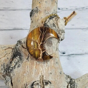 Tigers Eye Golden Wire Wrapped Half Moon Pendant with 18in Chain.