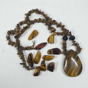 Lot of tigers eye. Includes a necklace with teardrop pendant, a handful of small gemstones, and a larger specimen. The larger piece is about 4 inches wide and weighs 573 grams (about 1lb 4oz).